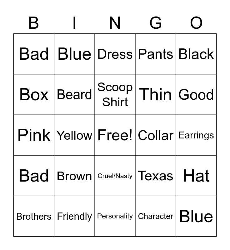 This bingo card has a free space and 28 words: Hat, Shirt, Thin, Character, Box, Dress, Blue, Bad, Collar, Brothers, Pink, Pants, Friendly, Personality, Good, Polka Dots, Brown, Beard, Scoop Shirt, Cruel/Nasty, Bad, Stuck Up, Blue, Yellow, Earrings, Texas, Black and White.