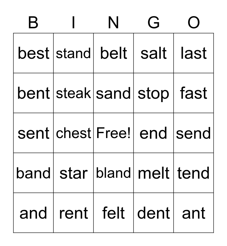 This bingo card has a free space and 24 words: star, rent, sand, and, last, best, bent, stand, end, bland, stop, sent, melt, tend, steak, dent, send, belt, fast, chest, ant, band, salt and felt.