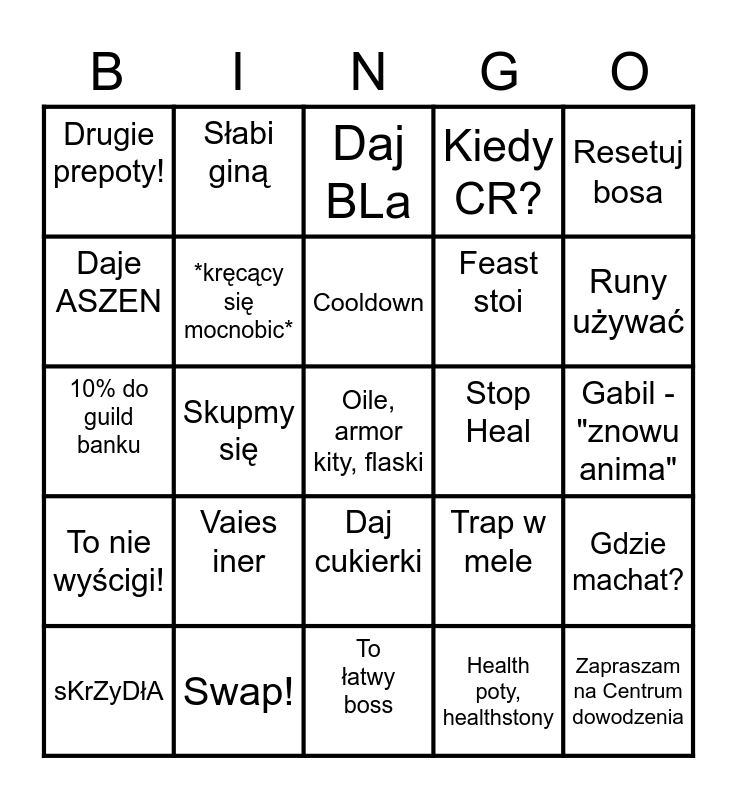 This bingo card has 25 words: Vaies iner, To łatwy boss, Cooldown, sKrZyDłA, Resetuj bosa, Drugie prepoty!, Daje ASZEN, Słabi giną, Stop Heal, Daj cukierki, Feast stoi, 10% do guild banku, Trap w mele, Gdzie machat?, *kręcący się mocnobic*, Zapraszam na Centrum dowodzenia, Gabil - "znowu anima", Daj BLa, Runy używać, Skupmy się, Oile, armor kity, flaski, Swap!, To nie wyścigi!, Kiedy CR? and Health poty, healthstony.