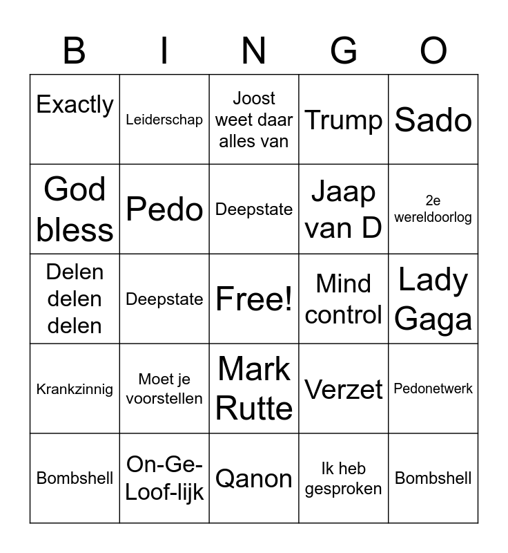 This bingo card has a free space and 24 words: Moet je voorstellen, On-Ge-Loof-lijk, Deepstate, Bombshell, Sado, Exactly, God bless, Leiderschap, Mind control, Mark Rutte, Jaap van D, Delen delen delen, Verzet, Pedonetwerk, Pedo, Ik heb gesproken, Lady Gaga, Joost weet daar alles van, 2e wereldoorlog, Deepstate, Bombshell, Krankzinnig, Trump and Qanon.