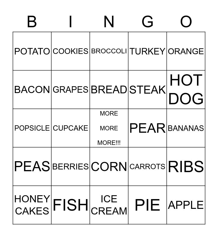 This bingo card has a free space and 24 words: BERRIES, FISH, BREAD, HONEY CAKES, ORANGE, POTATO, BACON, COOKIES, PEAR, CORN, STEAK, POPSICLE, CARROTS, RIBS, GRAPES, PIE, BANANAS, BROCCOLI, HOT DOG, CUPCAKE, APPLE, PEAS, TURKEY and ICE CREAM.