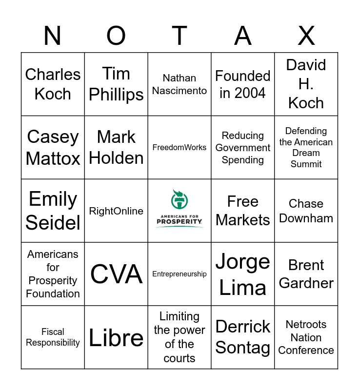 This bingo card has a free space and 24 words: CVA, Libre, FreedomWorks, Fiscal Responsibility, David H. Koch, Charles Koch, Casey Mattox, Tim Phillips, Free Markets, Entrepreneurship, Reducing Government Spending, Emily Seidel, Jorge Lima, Brent Gardner, Mark Holden, Derrick Sontag, Chase Downham, Nathan Nascimento, Defending the American Dream Summit, RightOnline, Netroots Nation Conference, Americans for Prosperity Foundation, Founded in 2004 and Limiting the power of the courts.