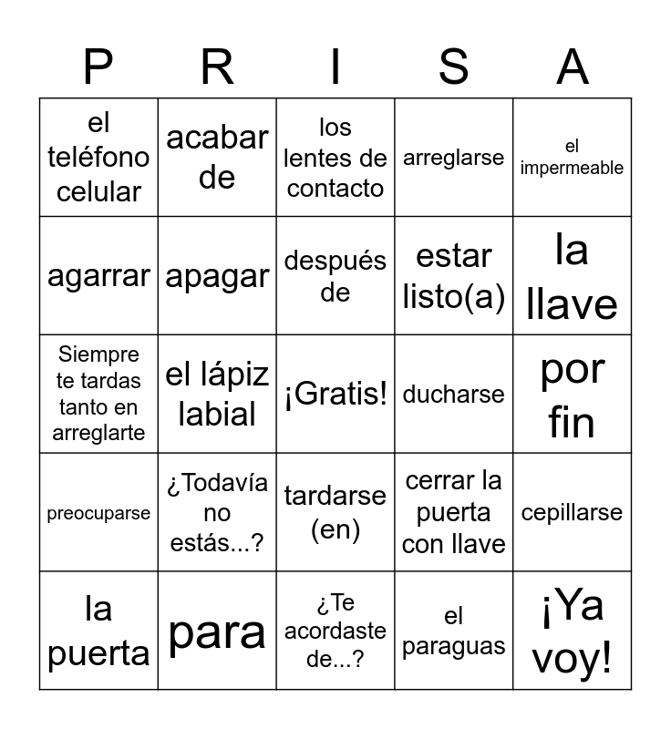 This bingo card has a free space and 51 words: ¡Date prisa!, ¡Ya voy!, ¿Estás seguro(a)?, ¿Te acordaste de...?, ¿Todavía no estás...?, ¿Trajiste tu...?, acabar de, acordarse de, agarrar, antes de, apagar, arreglarse, cepillarse, cerrar la puerta con llave, darle de comer, darse prisa, después de, ducharse, durante la semana, el impermeable, el lápiz labial, el paraguas, el teléfono celular, estar listo(a), irse, la crema, la llave, la luz, la puerta, los lentes de contacto, luego, necesitar, No se te olvide..., No te preocupes, No, no pude encontrarlo/la, para, peinarse, pintarse las uñas, ponerse, ponerse nervioso, por fin, preocuparse, primero, recoger, Se me olvidó por completo, Se nos hace tarde, Siempre te tardas tanto en arreglarte, Sólo me falta..., también, tardarse (en) and Tranquilo(a).