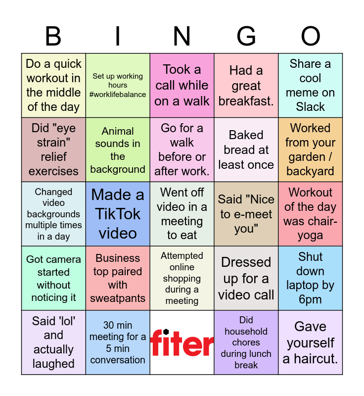 This bingo card has 1 images, a free space and 23 words: Business top paired with sweatpants, 30 min meeting for a 5 min conversation, Go for a walk before or after work., Said 'lol' and actually laughed, Share a cool meme on Slack, Do a quick workout in the middle of the day, Did "eye strain" relief exercises, Set up working hours #worklifebalance, Said "Nice to e-meet you", Attempted online shopping during a meeting, Baked bread at least once, Changed video backgrounds multiple times in a day, Dressed up for a video call, Shut down laptop by 6pm, Animal sounds in the background, Did household chores during lunch break, Workout of the day was chair-yoga, Took a call while on a walk, Worked from your garden / backyard, Made a TikTok video, Gave yourself a haircut., Got camera started without noticing it and Had a great breakfast..