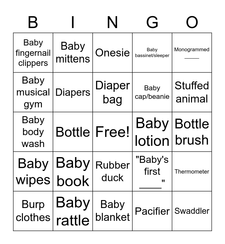 This bingo card has a free space and 29 words: Burp clothes, Baby booties, Bottle, Baby booger suction, Baby fingernail clippers, Onesie, Diapers, Baby book, Baby lotion, Baby rattle, Bottle brush, Swaddler, Baby blanket, Pacifier, Stuffed animal, Baby photo album, Rubber duck, Baby wipes, Monogrammed _____, Baby body wash, "Baby's first ____", Hooded towel set, Baby cap/beanie, Baby musical gym, Baby bassinet/sleeper, Baby mittens, Thermometer, Diaper bag and Baby wash clothes.