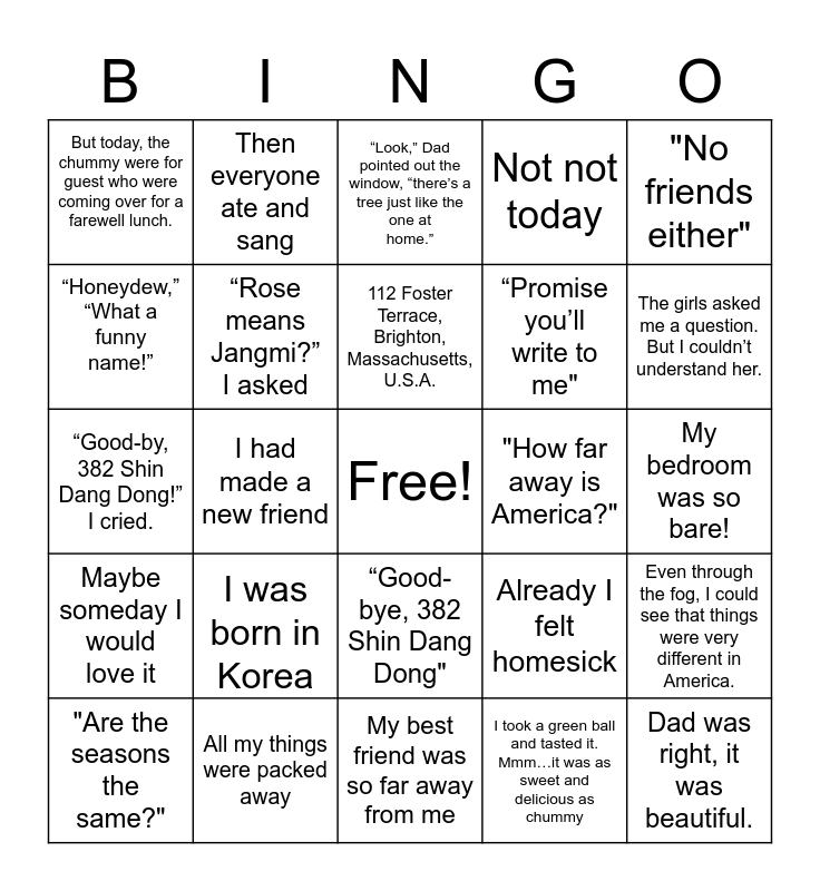 This bingo card has a free space and 24 words: I was born in Korea, All my things were packed away, 112 Foster Terrace, Brighton, Massachusetts, U.S.A., "Are the seasons the same?", "No friends either", But today, the chummy were for guest who were coming over for a farewell lunch., “Honeydew,” “What a funny name!”, Then everyone ate and sang, "How far away is America?", “Good-bye, 382 Shin Dang Dong", “Promise you’ll write to me", “Good-by, 382 Shin Dang Dong!” I cried., Already I felt homesick, Even through the fog, I could see that things were very different in America., “Rose means Jangmi?” I asked, I took a green ball and tasted it. Mmm…it was as sweet and delicious as chummy, My bedroom was so bare!, “Look,” Dad pointed out the window, “there’s a tree just like the one at home.”, The girls asked me a question. But I couldn’t understand her., I had made a new friend, Dad was right, it was beautiful., Maybe someday I would love it, Not not today and My best friend was so far away from me.