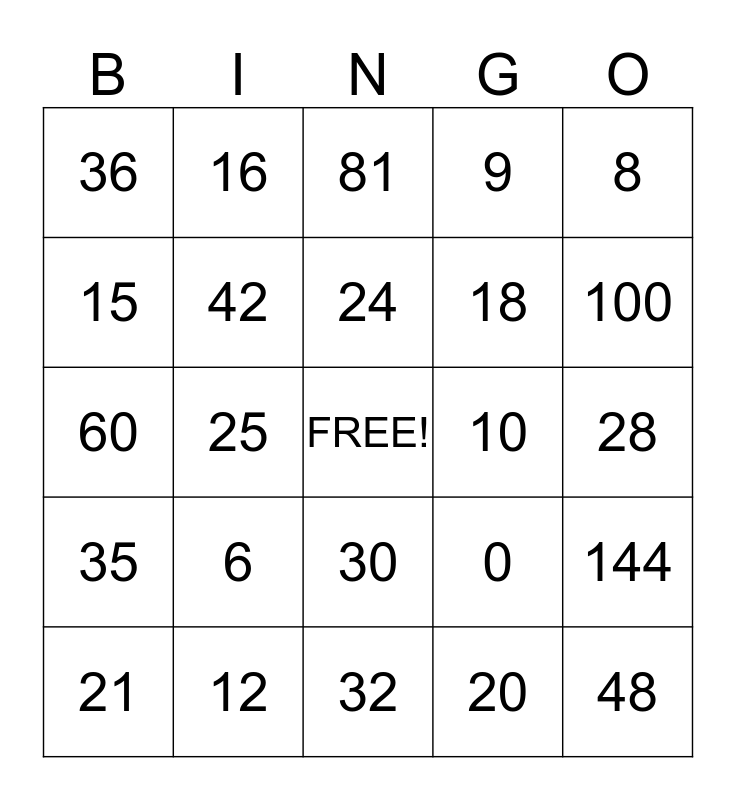 This bingo card has a free space and 24 words: 6, 12, 24, 21, 8, 36, 15, 16, 10, 30, 18, 60, 0, 144, 42, 20, 28, 81, 100, 25, 48, 35, 9 and 32.