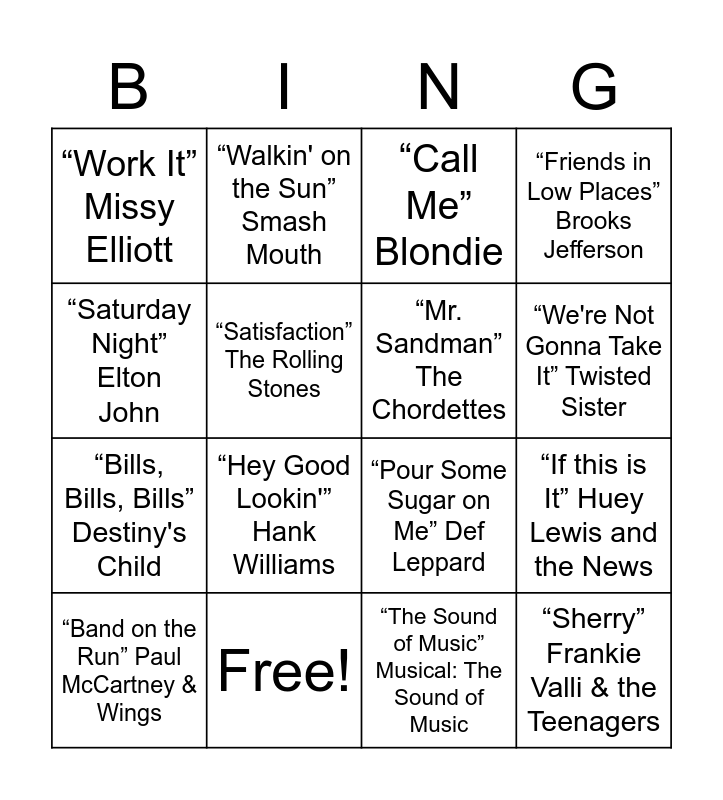This bingo card has 16 words: Free!, “If this is It” Huey Lewis and the News, “Call Me” Blondie, “Work It” Missy Elliott, “Bills, Bills, Bills” Destiny's Child, “Walkin' on the Sun” Smash Mouth, “Pour Some Sugar on Me” Def Leppard, “The Sound of Music” Musical: The Sound of Music, “Saturday Night” Elton John, “Satisfaction” The Rolling Stones, “Band on the Run” Paul McCartney & Wings, “Friends in Low Places” Brooks Jefferson, “Hey Good Lookin'” Hank Williams, “We're Not Gonna Take It” Twisted Sister, “Mr. Sandman” The Chordettes and “Sherry” Frankie Valli & the Teenagers.