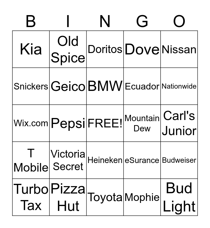 This bingo card has a free space and 24 words: Victoria Secret, Pizza Hut, BMW, Turbo Tax, Nissan, Kia, Snickers, Old Spice, Mountain Dew, Heineken, Ecuador, Wix.com, eSurance, Budweiser, Geico, Mophie, Carl's Junior, Doritos, Nationwide, Pepsi, Bud Light, T Mobile, Dove and Toyota.
