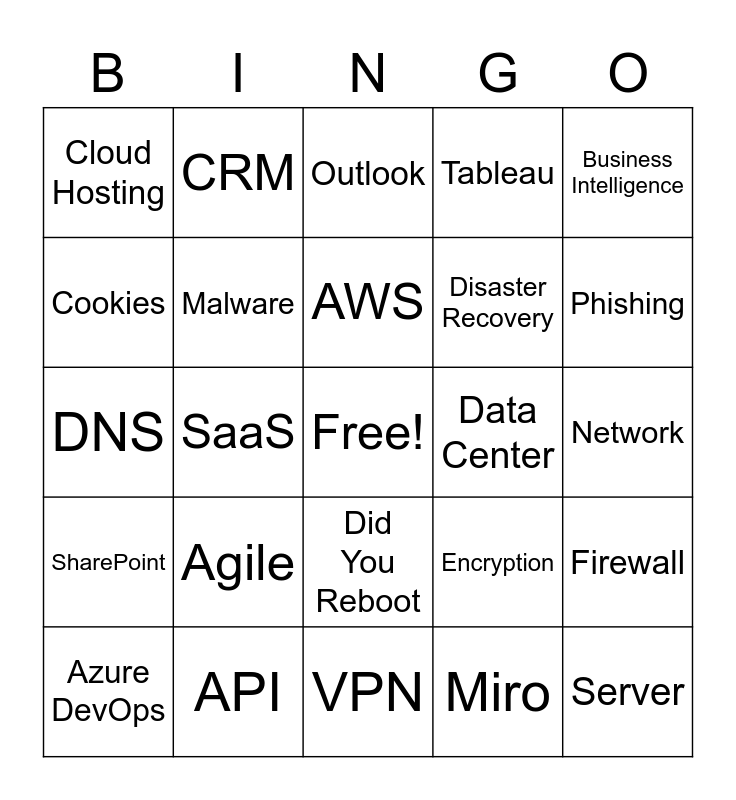 This bingo card has a free space and 24 words: Agile, API, AWS, Azure DevOps, Business Intelligence, Cloud Hosting, Cookies, CRM, Data Center, Did You Reboot, Disaster Recovery, DNS, Encryption, Firewall, Malware, Miro, Network, Outlook, Phishing, SaaS, Server, SharePoint, Tableau and VPN.