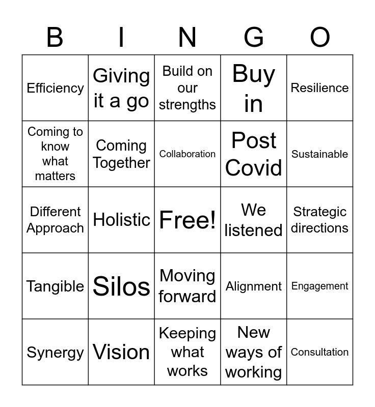 This bingo card has a free space and 24 words: Silos, Vision, Collaboration, Synergy, Resilience, Efficiency, Coming to know what matters, Giving it a go, We listened, Moving forward, Post Covid, Different Approach, Alignment, Engagement, Coming Together, New ways of working, Strategic directions, Build on our strengths, Sustainable, Holistic, Consultation, Tangible, Buy in and Keeping what works.