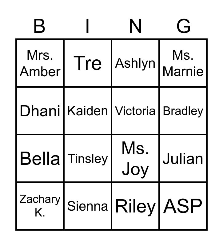This bingo card has 17 words: Riley, Zachary K., Ashlyn, Mrs. Amber, Tinsley, Ms. Marnie, Julian, Victoria, Bradley, Kaiden, Sienna, Ms. Joy, Dhani, Tre, Bella, Ms. Aya'Sha and ASP.