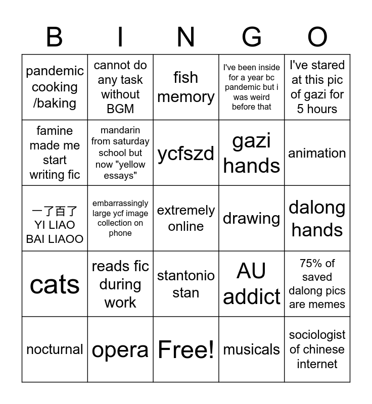 This bingo card has 25 words: cats, opera, extremely online, musicals, I've stared at this pic of gazi for 5 hours, pandemic cooking /baking, cannot do any task without BGM, fish memory, drawing, 75% of saved dalong pics are memes, famine made me start writing fic, mandarin from saturday school but now "yellow essays", Free!, AU addict, animation, nocturnal, embarrassingly large ycf image collection on phone, ycfszd, gazi hands, dalong hands, 一了百了 YI LIAO BAI LIAOO, reads fic during work, stantonio stan, I've been inside for a year bc pandemic but i was weird before that and sociologist of chinese internet.