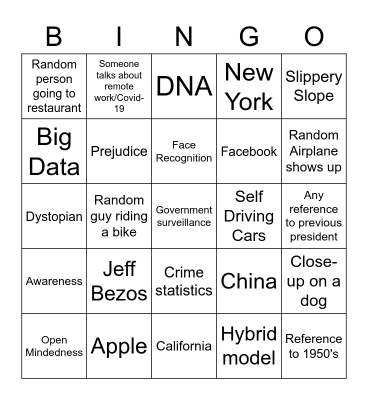 This bingo card has a free space and 24 words: Jeff Bezos, Apple, Face Recognition, Open Mindedness, Slippery Slope, Random person going to restaurant, Big Data, Someone talks about remote work/Covid-19, Self Driving Cars, Crime statistics, Facebook, Dystopian, China, Close-up on a dog, Prejudice, Hybrid model, Any reference to previous president, DNA, Random Airplane shows up, Random guy riding a bike, Reference to 1950's, Awareness, New York and California.