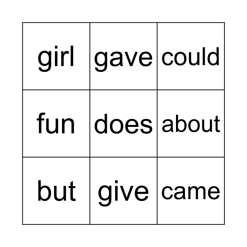 This bingo card has a free space and 8 words: about, could, gave, but, girl, came, fun and give.