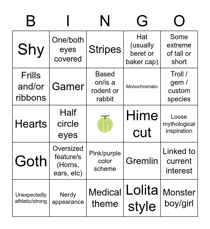 This bingo card has a free space and 24 words: Oversized feature/s (Horns, ears, etc), Nerdy appearance, Based on/is a rodent or rabbit, Unexpectedly athletic/strong, Some extreme of tall or short, Shy, Frills and/or ribbons, One/both eyes covered, Hime cut, Pink/purple color scheme, Monochromatic, Hearts, Gremlin, Linked to current interest, Gamer, Lolita style, Loose mythological inspiration, Stripes, Troll / gem / custom species, Half circle eyes, Monster boy/girl, Goth, Hat (usually beret or baker cap) and Medical theme.