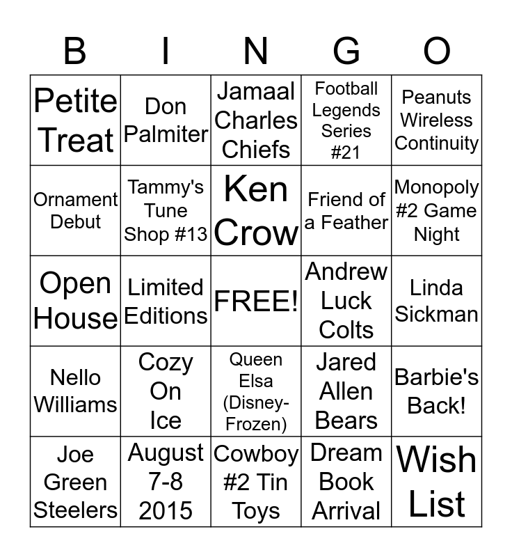 This bingo card has a free space and 24 words: Cozy On Ice, August 7-8 2015, Ken Crow, Joe Green Steelers, Peanuts Wireless Continuity, Petite Treat, Ornament Debut, Don Palmiter, Andrew Luck Colts, Queen Elsa (Disney- Frozen), Friend of a Feather, Open House, Jared Allen Bears, Barbie's Back!, Tammy's Tune Shop #13, Dream Book Arrival, Linda Sickman, Jamaal Charles Chiefs, Monopoly #2 Game Night, Limited Editions, Wish List, Nello Williams, Football Legends Series #21 and Cowboy #2 Tin Toys.