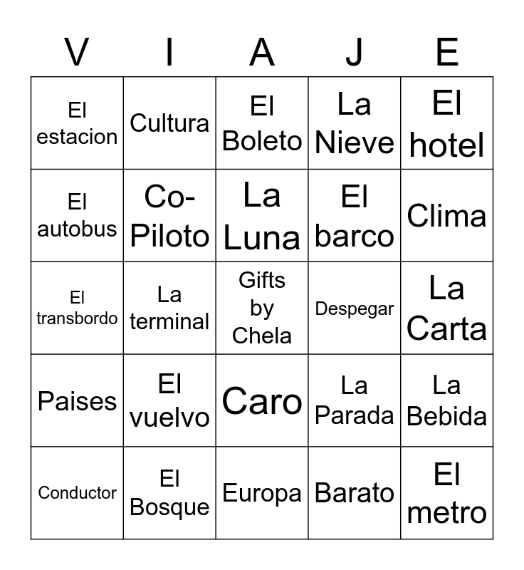 This bingo card has a free space and 85 words: El Aeropuerto, El Pasaporte, El Boleto, Un Viaje, Hawaii, Turbulencia, Asafata, Piloto, El Avion, Tarifas, La Salida, El tren, Co-Piloto, Despegar, Aterrizar, El estacion, Conductor, El autobus, La bicicleta, El taxi, El carro, El barco, El metro, Llegadas, La terminal, La aduana, Maletas, Dinero, El peso, El euro, El vuelvo, El destino, El horario, El transbordo, El turista, El Norte, Europa, Extranjero, Paises, Clima, Tropical, El Sur, El Oeste, El Este, Estados Unidos, Mexico, El Salvador, Alemania, El sol, Un pueblo, Cultura, La Luna, El Horizonte, La Comida, El Flamenco, El Mar, El Bosque, La Nieve, El Desierto, Amacas, La Calle, Un Banco, El Bano, El Flan, La Casita, El hotel, La Tarjeta de Credito, La Bebida, La Cerveza, Espana, El Cafecito, La Cuenta, Internacional, Viajar, El Exterior, Caro, Barato, El Cambio, Coins, Las Estampillas, La Carta, La Motocicleta, El Bote, La Parada and El Mapa.