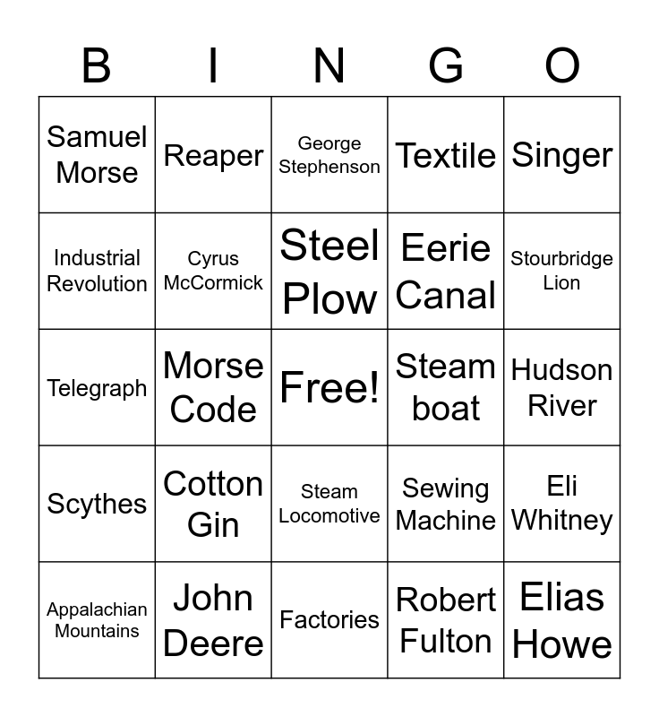 This bingo card has a free space and 24 words: Cotton Gin, John Deere, Steel Plow, Appalachian Mountains, Singer, Samuel Morse, Industrial Revolution, Reaper, Steam boat, Steam Locomotive, Eerie Canal, Telegraph, Sewing Machine, Eli Whitney, Cyrus McCormick, Robert Fulton, Hudson River, George Stephenson, Stourbridge Lion, Morse Code, Elias Howe, Scythes, Textile and Factories.