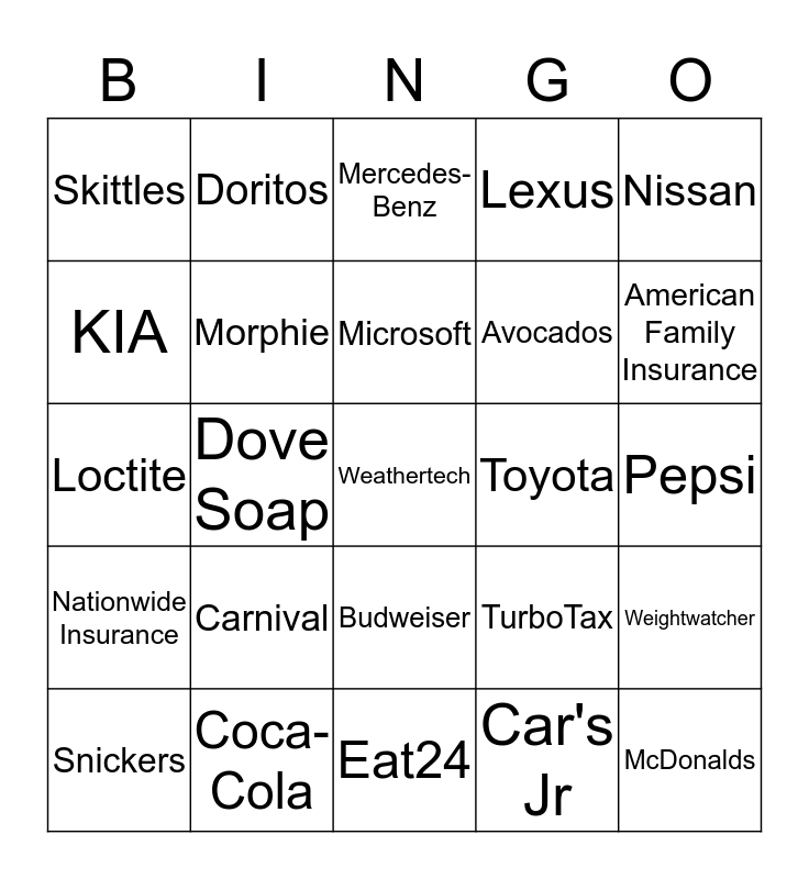 This bingo card has 29 words: Snickers, Wix.com, Dove Soap, McDonalds, Skittles, Mercedes- Benz, Morphie, Carnival, Toyota, Coca-Cola, Pepsi, Weathertech, Eat24, Car's Jr, American Family Insurance, Bud Light, Budweiser, Nationwide Insurance, Nissan, Loctite, TurboTax, BMW, Avocados, KIA, Lexus, Doritos, Weightwatcher, Microsoft and Esurance.