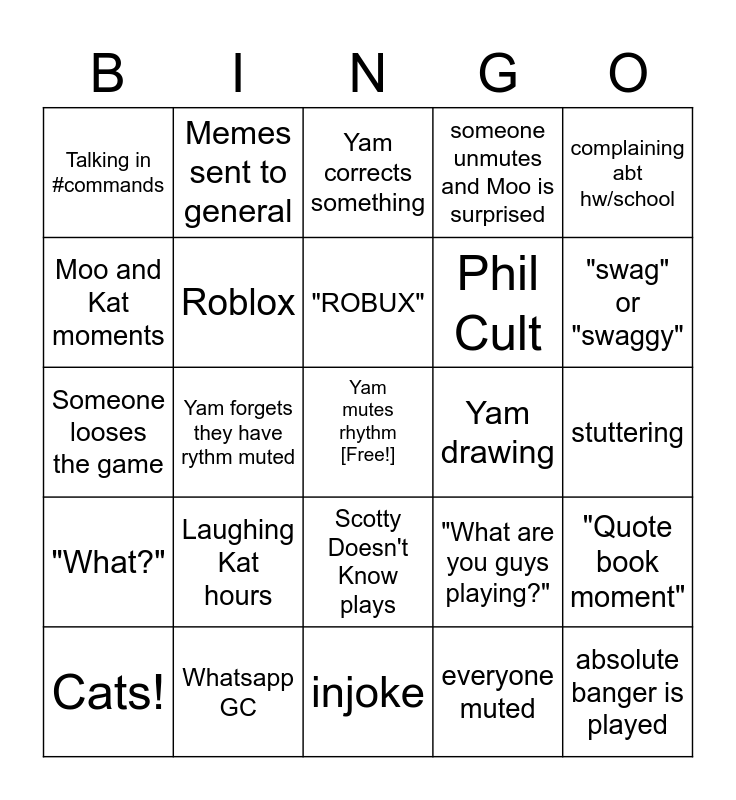 This bingo card has a free space and 40 words: Phil, Yam forgets they have rythm muted, Feral chaotic Chloe, Yam drawing, Playing games in lessons, Cats!, Roblox, someone is based, Phil Cult, "Quote book moment", Someone looses the game, Memes sent to general, everyone muted, stuttering, "What?", Laughing Kat hours, Moo adds someone else's playlist, someone unmutes and Moo is surprised, Yam screenshares, Talking in #commands, Whatsapp GC, "ROBUX", "What are you guys playing?", "swag" or "swaggy", Kat says "thicc", "when the imposter is sus 😳", injoke, clown to clown communication, watching media (netflix, social media, ect), cursed moment, Yam and Moo reference DSMP, Yam corrects something, Musical instrument, absolute banger is played, Moo and Kat moments, same 2 jokes, Scotty Doesn't Know plays, singing, complaining abt hw/school and Kat makes vine/tiktok reference.