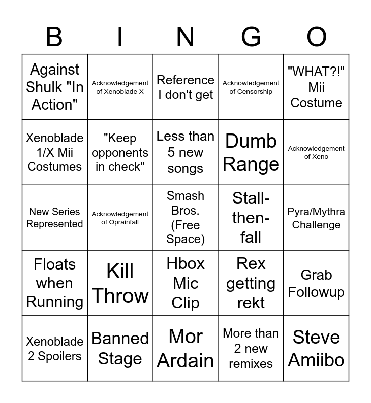 This bingo card has a free space and 24 words: Kill Throw, Banned Stage, Less than 5 new songs, Xenoblade 2 Spoilers, "WHAT?!" Mii Costume, Against Shulk "In Action", Xenoblade 1/X Mii Costumes, Acknowledgement of Xenoblade X, Stall-then-fall, Hbox Mic Clip, Dumb Range, New Series Represented, Rex getting rekt, Grab Followup, "Keep opponents in check", More than 2 new remixes, Pyra/Mythra Challenge, Reference I don't get, Acknowledgement of Xeno, Acknowledgement of Oprainfall, Steve Amiibo, Floats when Running, Acknowledgement of Censorship and Mor Ardain.