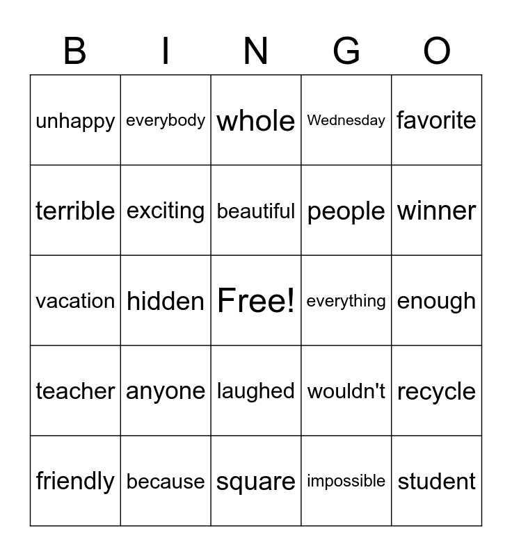 This bingo card has a free space and 24 words: anyone, because, beautiful, friendly, favorite, unhappy, terrible, everybody, everything, laughed, people, vacation, wouldn't, recycle, exciting, impossible, enough, whole, winner, hidden, student, teacher, Wednesday and square.