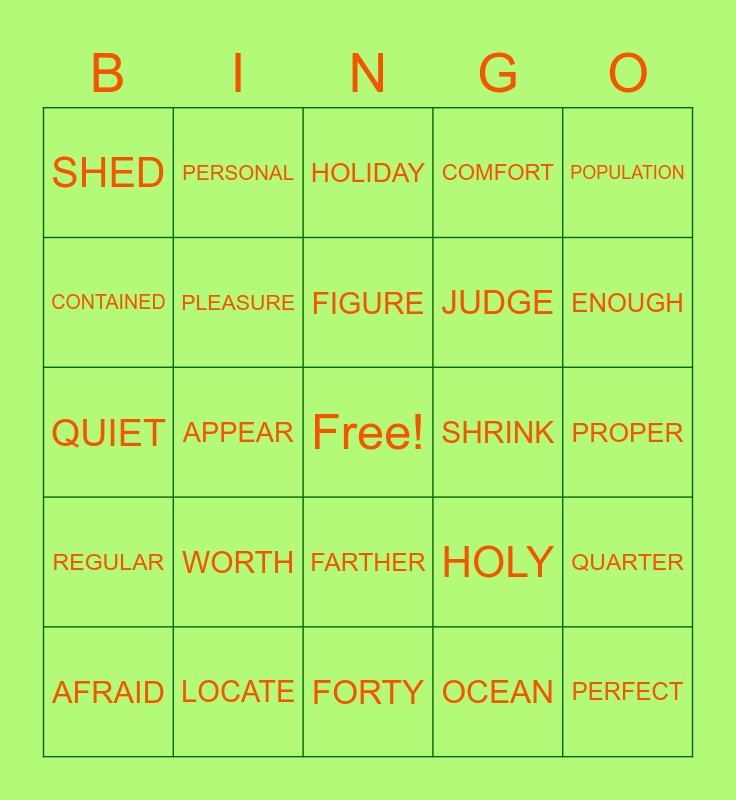 This bingo card has a free space and 24 words: WORTH, LOCATE, FIGURE, AFRAID, POPULATION, SHED, CONTAINED, PERSONAL, SHRINK, FARTHER, JUDGE, QUIET, HOLY, QUARTER, PLEASURE, OCEAN, PROPER, HOLIDAY, ENOUGH, APPEAR, PERFECT, REGULAR, COMFORT and FORTY.