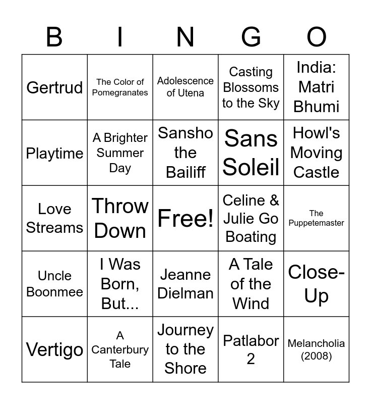 This bingo card has a free space and 24 words: I Was Born, But..., A Canterbury Tale, Sansho the Bailiff, Vertigo, India: Matri Bhumi, Gertrud, Playtime, The Color of Pomegranates, Celine & Julie Go Boating, Jeanne Dielman, Sans Soleil, Love Streams, A Tale of the Wind, Close-Up, A Brighter Summer Day, Patlabor 2, The Puppetemaster, Adolescence of Utena, Howl's Moving Castle, Throw Down, Melancholia (2008), Uncle Boonmee, Casting Blossoms to the Sky and Journey to the Shore.
