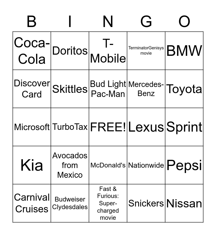 This bingo card has a free space and 24 words: Avocados from Mexico, Budweiser Clydesdales, Bud Light Pac-Man, Carnival Cruises, BMW, Coca-Cola, Discover Card, Doritos, Lexus, McDonald's, Mercedes-Benz, Microsoft, Nationwide, Pepsi, Skittles, Snickers, Sprint, T-Mobile, Toyota, TurboTax, Nissan, Kia, TerminatorGenisys movie and Fast & Furious: Super- charged movie.