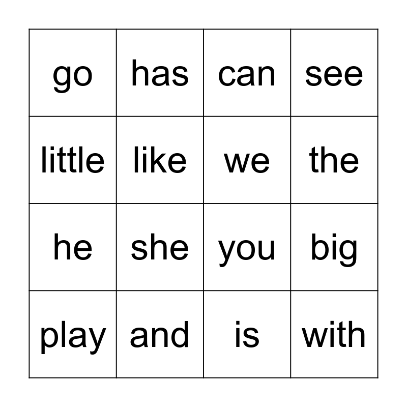 This bingo card has 16 words: and, big, can, go, he, has, you, is, little, like, play, see, she, the, we and with.