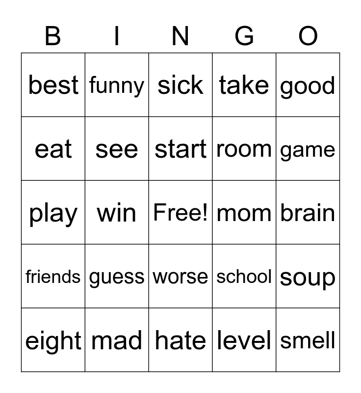 This bingo card has a free space and 27 words: school, grandpa, room, hate, eat, sick, funny, friends, mom, soup, play, take, eight, mad, game, guest, see, start, guess, best, brain, level, win, smell, worse, good and feel.