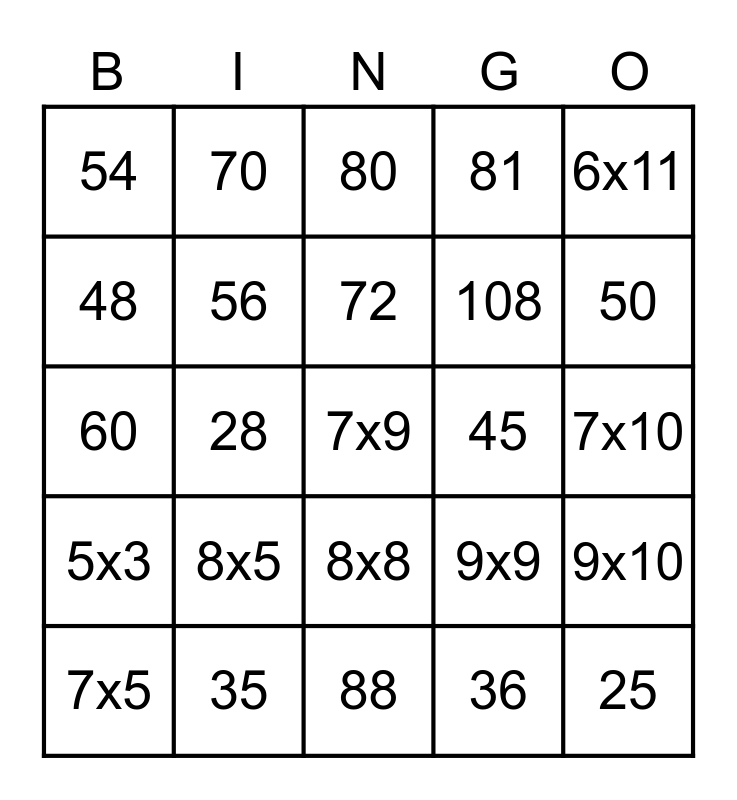 This bingo card has 59 words: 36, 35, 40, 45, 25, 42, 56, 64, 81, 20, 48, 63, 72, 90, 15, 54, 28, 80, 99, 50, 60, 70, 88, 36, 55, 66, 77, 96, 108, 60, 6x6, 6x8, 6x9, 6x10, 6x11, 7x5, 7x8, 7x9, 7x4, 7x10, 7x11, 8x5, 8x8, 8x9, 8x10, 8x11, 8x12, 9x5, 9x9, 9x10, 9x11, 9x4, 9x12, 5x5, 5x4, 5x3, 5x10, 5x11 and 5x12.