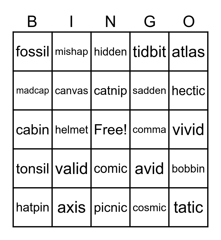 This bingo card has a free space and 24 words: valid, axis, catnip, hatpin, atlas, fossil, madcap, mishap, comma, comic, sadden, cabin, avid, bobbin, canvas, cosmic, vivid, hidden, hectic, helmet, tatic, tonsil, tidbit and picnic.