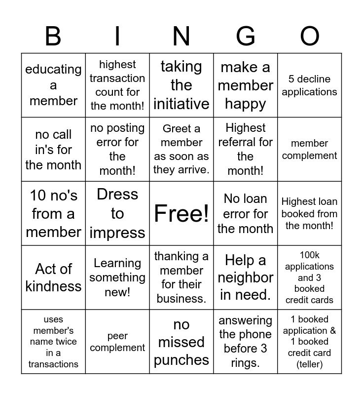 This bingo card has a free space and 24 words: Learning something new!, peer complement, Greet a member as soon as they arrive., uses member's name twice in a transactions, 5 decline applications, educating a member, no call in's for the month, highest transaction count for the month!, No loan error for the month, thanking a member for their business., Highest referral for the month!, 10 no's from a member, Help a neighbor in need., 100k applications and 3 booked credit cards, no posting error for the month!, answering the phone before 3 rings., Highest loan booked from the month!, taking the initiative, member complement, Dress to impress, 1 booked application & 1 booked credit card (teller), Act of kindness, make a member happy and no missed punches.