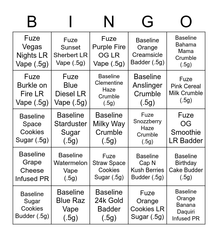 This bingo card has a free space and 24 words: Baseline Watermelon Vape (.5g), Baseline Blue Raz Vape (.5g), Baseline Clementine Haze Crumble (.5g), Baseline Sugar Cookies Budder (.5g), Baseline Bahama Mama Crumble (.5g), Fuze Vegas Nights LR Vape (.5g), Fuze Burkle on Fire LR Vape (.5g), Fuze Sunset Sherbert LR Vape (.5g), Fuze Snozzberry Haze Crumble (.5g), Fuze Straw Space Cookies Sugar (.5g), Baseline Anslinger Crumble (.5g), Baseline Space Cookies Sugar (.5g), Baseline Cap N Kush Berries Budder (.5g), Baseline Birthday Cake Budder (.5g), Fuze Blue Diesel LR Vape (.5g), Fuze Orange Cookies LR Sugar (.5g), Fuze OG Smoothie LR Badder, Fuze Purple Fire OG LR Vape (.5g), Fuze Pink Cereal Milk Crumble (.5g), Baseline Starduster Sugar (.5g), Baseline Orange Banana Daquiri Infused PR, Baseline Grape Cheese Infused PR, Baseline Orange Creamsicle Badder (.5g) and Baseline 24k Gold Badder (.5g).