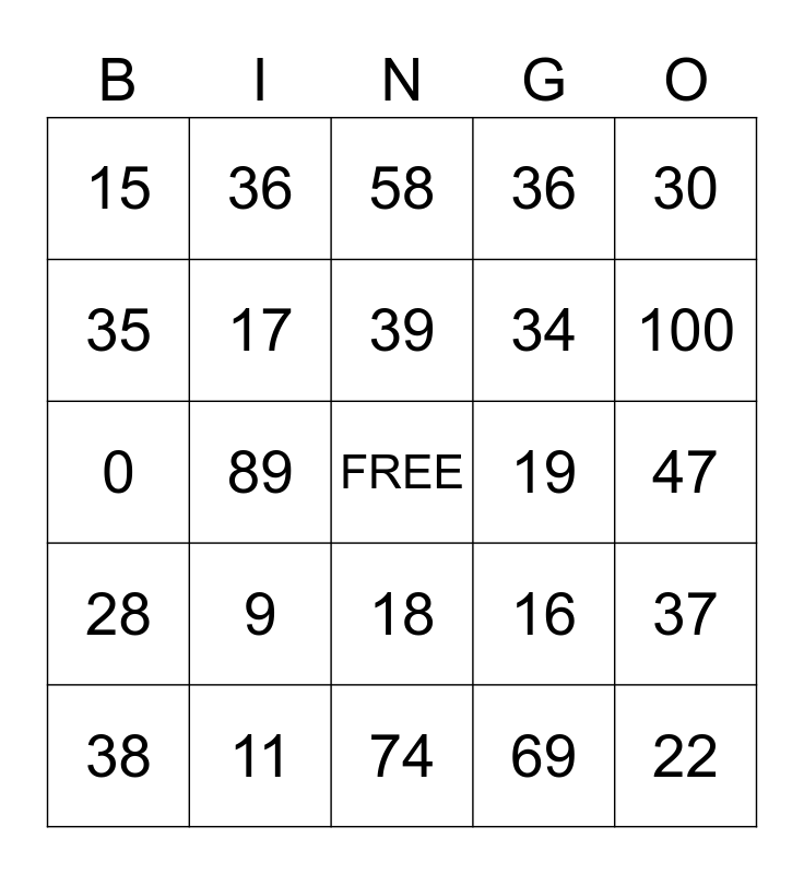 This bingo card has a free space and 30 words: 11, 53, 89, 14, 15, 58, 17, 18, 19, 74, 47, 22, 69, 24, 100, 79, 16, 28, 9, 30, 0, 32, 36, 34, 35, 36, 37, 38, 39 and 40.