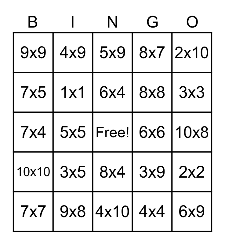 This bingo card has a free space and 24 words: 3x5, 9x8, 6x4, 7x7, 2x10, 9x9, 7x5, 4x9, 6x6, 8x4, 8x8, 7x4, 3x9, 2x2, 1x1, 4x4, 10x8, 5x9, 3x3, 5x5, 6x9, 10x10, 8x7 and 4x10.