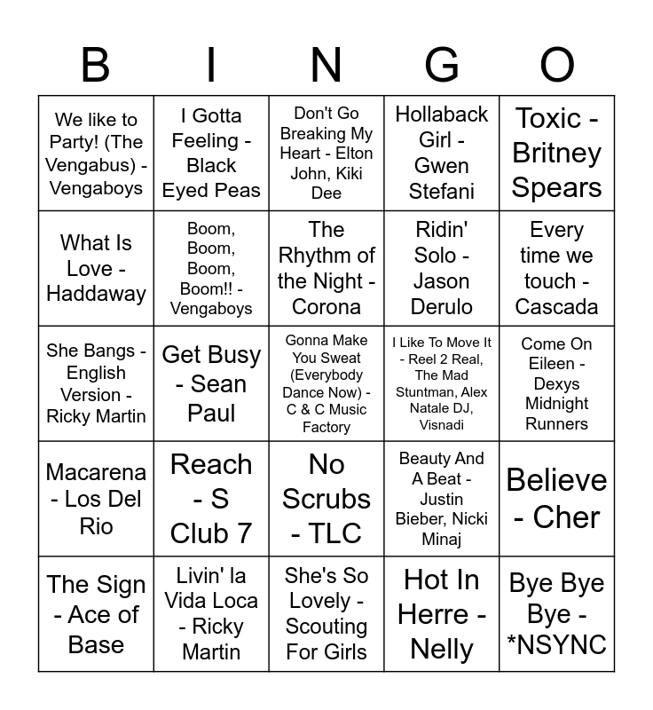 This bingo card has 25 words: Reach - S Club 7, She's So Lovely - Scouting For Girls, The Rhythm of the Night - Corona, The Sign - Ace of Base, Toxic - Britney Spears, We like to Party! (The Vengabus) - Vengaboys, What Is Love - Haddaway, I Gotta Feeling - Black Eyed Peas, I Like To Move It - Reel 2 Real, The Mad Stuntman, Alex Natale DJ, Visnadi, No Scrubs - TLC, Ridin' Solo - Jason Derulo, She Bangs - English Version - Ricky Martin, Beauty And A Beat - Justin Bieber, Nicki Minaj, Believe - Cher, Boom, Boom, Boom, Boom!! - Vengaboys, Bye Bye Bye - *NSYNC, Come On Eileen - Dexys Midnight Runners, Don't Go Breaking My Heart - Elton John, Kiki Dee, Every time we touch - Cascada, Get Busy - Sean Paul, Gonna Make You Sweat (Everybody Dance Now) - C & C Music Factory, Livin' la Vida Loca - Ricky Martin, Macarena - Los Del Rio, Hollaback Girl - Gwen Stefani and Hot In Herre - Nelly.