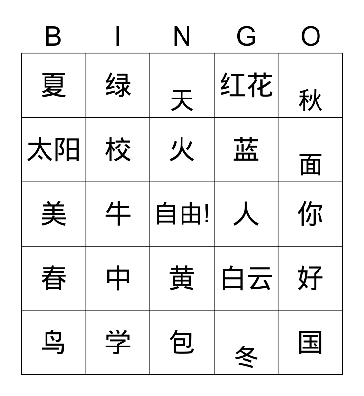 This bingo card has a free space and 24 words: 中, 学, 火, 鸟, 秋, 夏, 太阳, 绿, 人, 黄, 蓝, 美, 白云, 好, 校, 冬, 你, 天, 面, 牛, 国, 春, 红花 and 包.