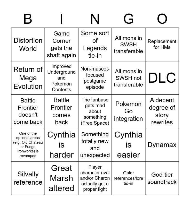 This bingo card has a free space and 24 words: Cynthia is harder, Great Marsh altered, Non-mascot-focused postgame episode, Silvally reference, Replacement for HMs, Distortion World, Return of Mega Evolution, Game Corner gets the shaft again, Pokemon Go integration, Something totally new and unexpected, All mons in SWSH not transferable, Battle Frontier doesn't come back, Cynthia is easier, Dynamax, Improved Underground and Pokemon Contests, Galar references/lore tie-in, A decent degree of story rewrites, Some sort of Legends tie-in, DLC, Battle Frontier comes back, God-tier soundtrack, One of the optional areas (e.g. Old Chateau or Fuego Ironworks) is revamped, All mons in SWSH transferable and Player character rival and/or Charon actually get a proper fight.