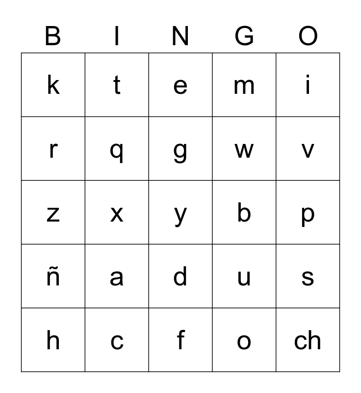 This bingo card has a free space and 24 words: a, c, g, h, i, k, r, t, b, d, w, z, u, s, q, o, p, e, v, x, ch, ñ, m and f.