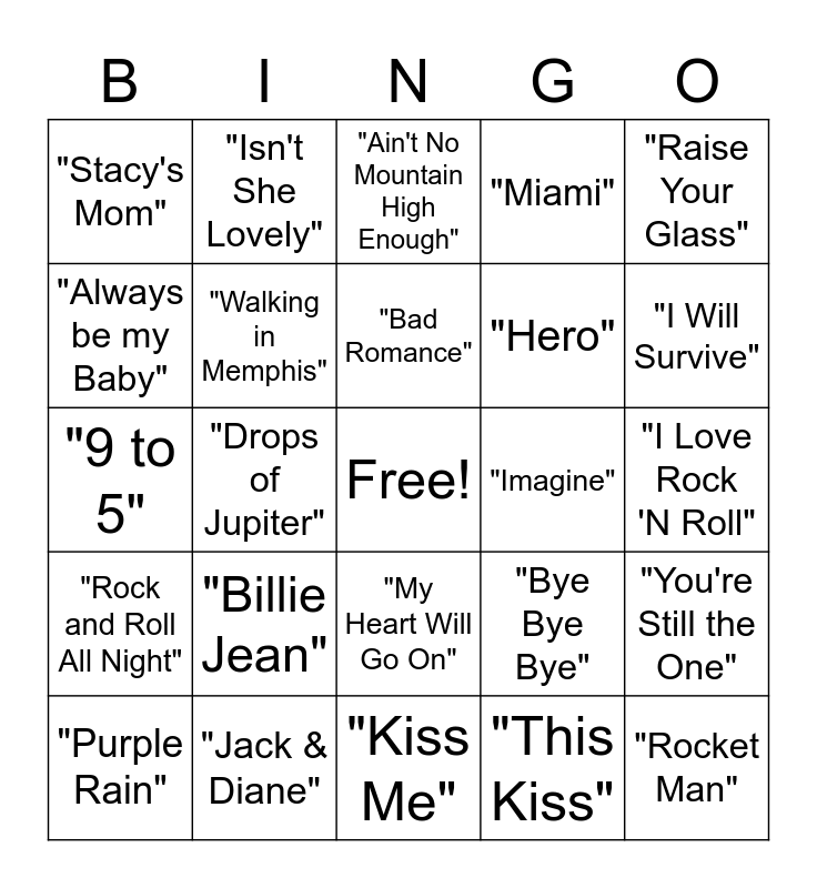 This bingo card has a free space and 96 words: Songs We all Know, "Like a Rolling Stone", "(I Can't Get No) Satisfaction", "Imagine", "Respect", "Good Vibrations", "Johnny B. Goode", "Hey Jude", "Smells Like Teen Spirit", "All Star", "I Will Always Love You", "Don't Stop Believin", "Wannabe", "I Will Survive", "Survivor", "Always be my Baby", "Bad Romance", "Total Eclipse of the Heart", "Mr Brightside", "Rolling in the Deep", "Bohemian Rhapsody", "All the Small Things", "Barbie Girl", "No Scrubs", "My Heart Will Go On", "Kiss Me", "You're the One That I Want", "Stacy's Mom", "Livin' On A Prayer", "She Will Be Loved", "Everybody", "Bye Bye Bye", "Shape of You", "Sweet Home Alabama", "Raise Your Glass", "Uptown Funk", "You're Still the One", "Free Fallin", "Only Wanna Be with You", "Drops of Jupiter", "Ice Ice Baby", "Purple Rain", "Rocket Man", "Jack & Diane", "Rock and Roll All Night", "Ain't No Mountain High Enough", "Rock you Like A Hurricane", "Eye of the Tiger", "Thriller", "You Shook Me All Night Long", "Old Time Rock and Roll", "Baby", "Irreplaceable", "Waterfalls", "Love Story", "Chandelier", "It's My Life", "Call Me Maybe", "In The End", "When September Ends", "I'll Be There for You", "Sweet Caroline", "Livin' la Vida Loca", "Dani California", "wonderwall", "I want it That Way", "Breakfast at Tiffany's", "This Is How We Do It", "Genie In a Bottle", "This Kiss", "3AM", "Man! I Feel Like a Woman!", "Let's Get Loud", "You Were Meant For Me", "She's so High", "I'll Make Love To You", "No Diggity", "Walking in Memphis", "Mambo No. 5", "Hero", "Miami", "Shoop", "Killing Me Softly With His Song", "Firework", "Jessie's Girl", "9 to 5", "Billie Jean", "Material Girl", "Push It", "I Love Rock 'N Roll", "Three Little Birds", "Dancing Queen", "Dancing in the Moonlight", "Bennie and the Jets", "Isn't She Lovely" and "Jolene".
