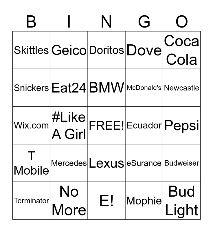 This bingo card has a free space and 24 words: Mercedes, No More, BMW, Terminator, Coca Cola, Skittles, Snickers, Geico, Ecuador, Lexus, McDonald's, Wix.com, eSurance, Budweiser, Eat24, Mophie, Pepsi, Doritos, Newcastle, #Like A Girl, Bud Light, T Mobile, Dove and E!.