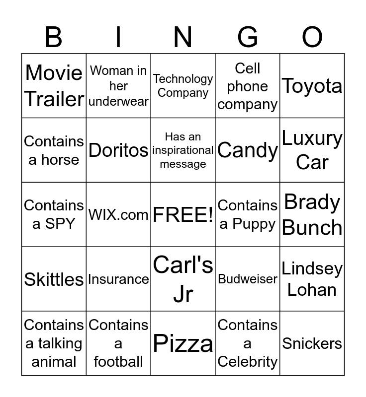 This bingo card has a free space and 31 words: Pizza, McDonalds, WIX.com, Carnival Cruises, Movie Trailer, Technology Company, Doritos, Budweiser, Contains a Puppy, Contains a Celebrity, Brady Bunch, Snickers, Kim Kardashian, Fast Food, Luxury Car, BMW, Lindsey Lohan, Insurance, Skittles, Carl's Jr, Toyota, Contains a baby, Contains a talking animal, Woman in her underwear, Candy, Contains a horse, Cell phone company, Contains a SPY, Contains a football, Has an inspirational message and Contains a music artist.