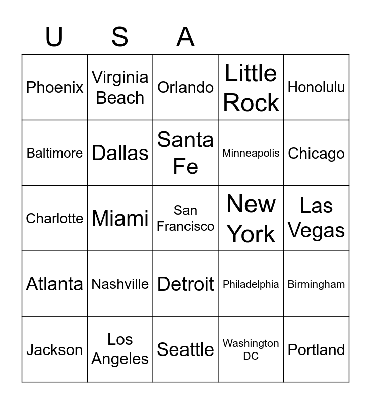 This bingo card has 30 words: Los Angeles, Denver, Miami, Boston, Phoenix, Orlando, Dallas, Detroit, New York, Seattle, Las Vegas, San Francisco, Washington DC, Portland, Chicago, New Orleans, Philadelphia, Atlanta, Nashville, Honolulu, Charlotte, St. Louis, Virginia Beach, Minneapolis, Baltimore, Little Rock, Birmingham, Jackson, Santa Fe and Salt Lake City.