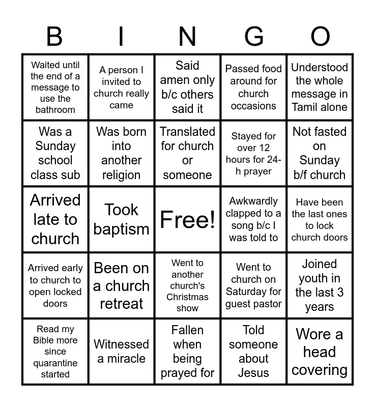This bingo card has a free space and 24 words: Been on a church retreat, Witnessed a miracle, Translated for church or someone, Read my Bible more since quarantine started, Understood the whole message in Tamil alone, Waited until the end of a message to use the bathroom, Was a Sunday school class sub, A person I invited to church really came, Awkwardly clapped to a song b/c I was told to, Went to another church's Christmas show, Stayed for over 12 hours for 24-h prayer, Arrived late to church, Went to church on Saturday for guest pastor, Joined youth in the last 3 years, Was born into another religion, Told someone about Jesus, Have been the last ones to lock church doors, Said amen only b/c others said it, Not fasted on Sunday b/f church, Took baptism, Wore a head covering, Arrived early to church to open locked doors, Passed food around for church occasions and Fallen when being prayed for.