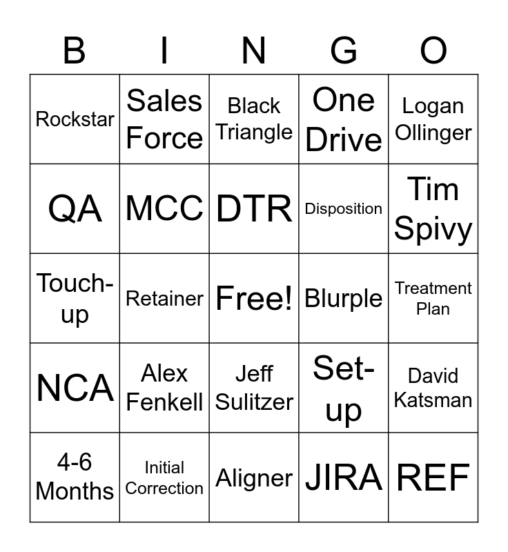 This bingo card has a free space and 31 words: Aligner, Revision, Retainer, Notes, Rockstar, Black Triangle, MCC, Set-up, Blurple, JIRA, Treatment Plan, REF, Smile Check, Files, Tim Spivy, Mark Oldani, David Katsman, Alex Fenkell, NCA, Jeff Sulitzer, Logan Ollinger, 8-10 Months, 4-6 Months, Sales Force, Disposition, QA, One Drive, Touch-up, Initial Correction, DTR and DTP.