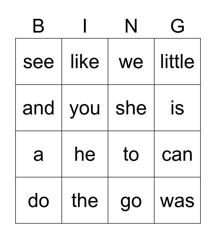 This bingo card has 16 words: the, can, we, see, a, like, to, go, and, you, do, little, he, is, she and was.