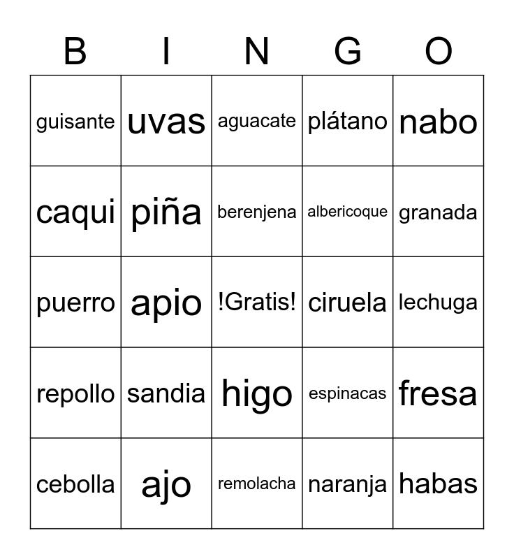 This bingo card has a free space and 29 words: cebolla, calabacín, apio, col lombarda, guisante, aguacate, piña, sandia, ciruela, ajo, lechuga, habas, remolacha, naranja, granada, espárrago, higo, repollo, nabo, puerro, espinacas, pepino, albericoque, caqui, plátano, uvas, fresa, berenjena and coliflor.